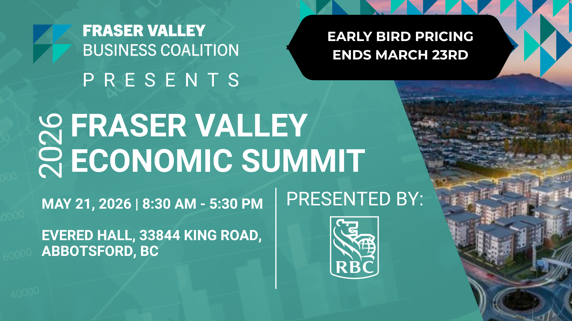 The 2nd Annual Fraser Valley Economic Summit, hosted by the Fraser Valley Business Coalition (FVBC) will be held at Evered Hall at UFV on May 21st, 2026. The Coalition is comprised of the Chambers of Commerce of Abbotsford, Mission and Langley.