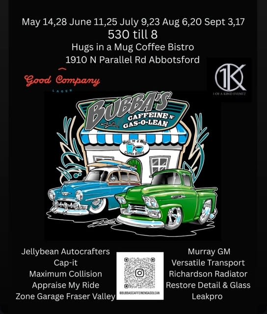 Join Hugs in a Mug every other Wednesday evening from May 14th to September 17th for Bubba’s Caffeine-n-Gas-o-Lean! Enjoy a spectacular showcase of Classic Cars, Hot Rods, Low Riders, great food, and refreshing drinks. Everyone is welcome, and participation is free. The car show runs from 5:30-8pm. Don't miss out on the fun!
